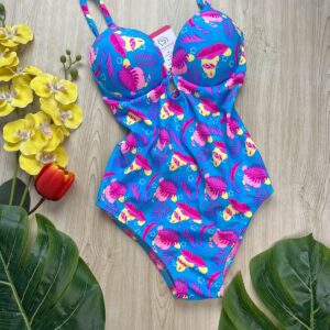 💙🦩 Enterizo “Flamingo Summer” – Fondo celeste con flamencos y frutas tropicales 🦩💙