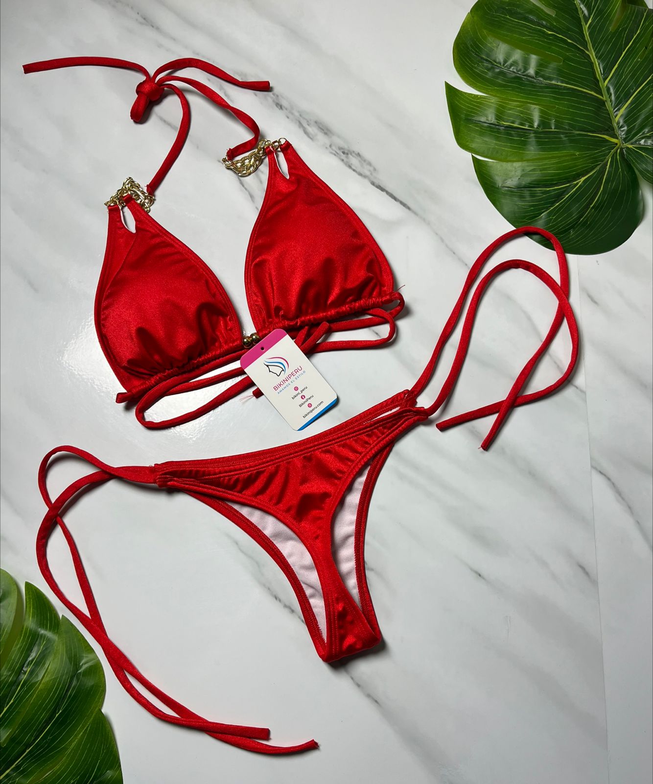 Este bikini es sinónimo de seducción. Su color rojo encendido y el brillo del tejido lo convierten en la opción perfecta para un look irresistible. El toque final lo dan las cadenas doradas: lujo y actitud en cada detalle. ❤️🔥