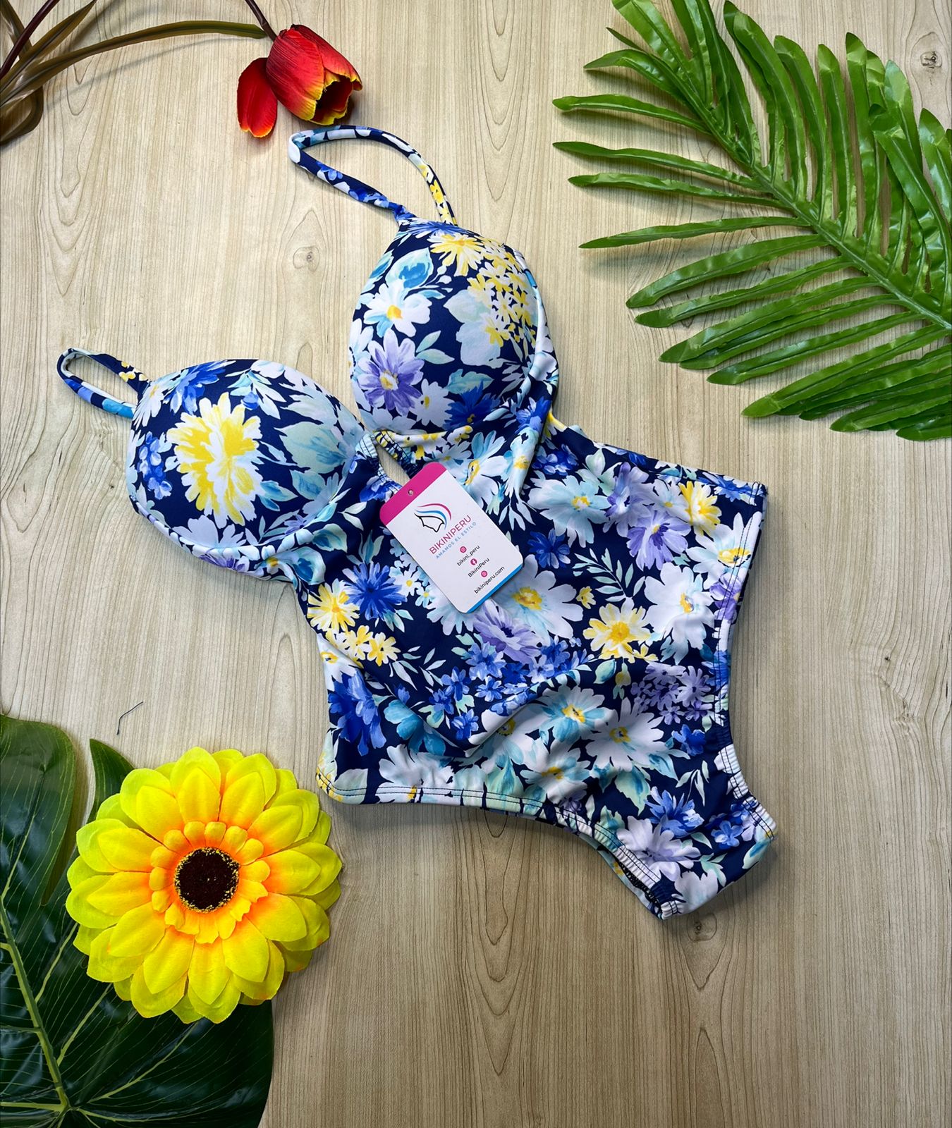 💙 Enterizo “Lirios Nocturnos” – Fondo azul con flores vibrantes