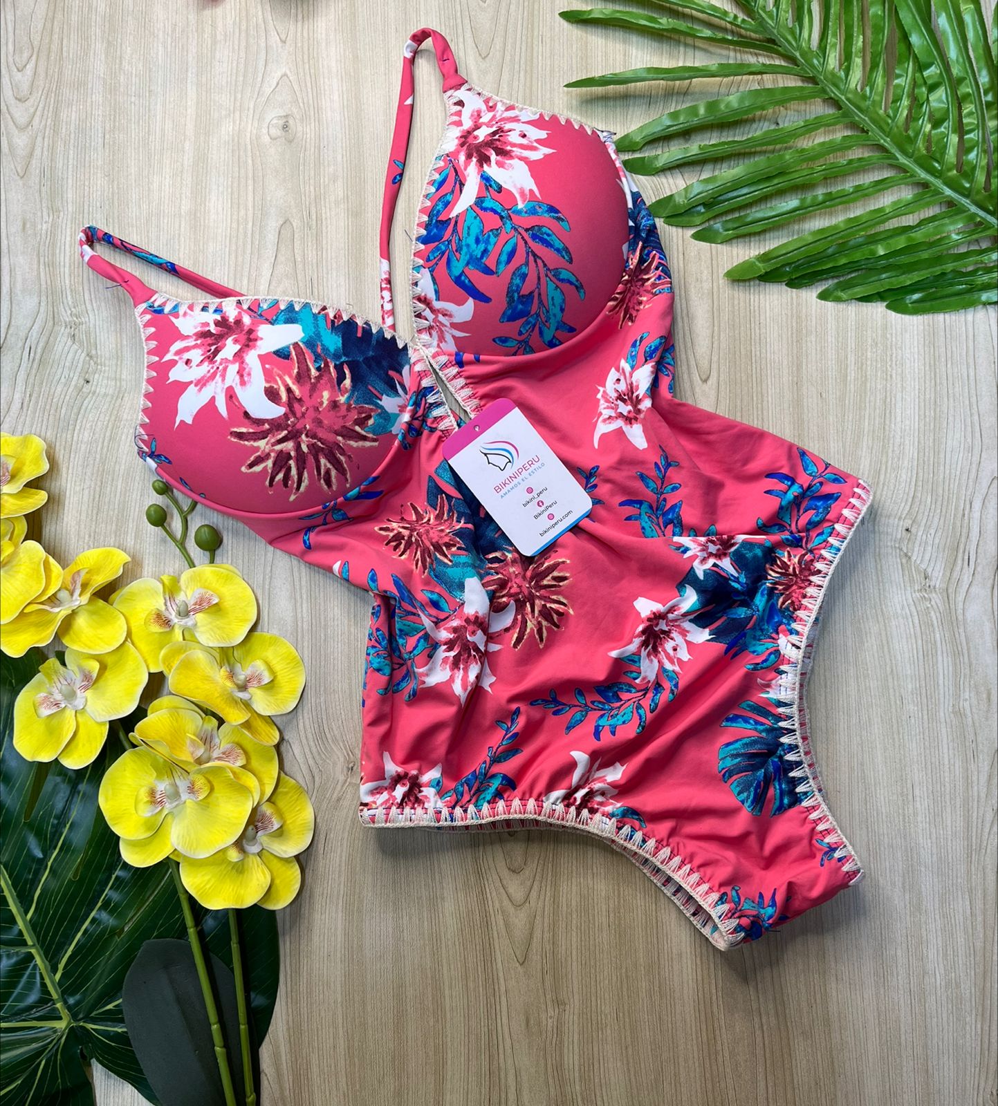 💛 Enterizo “Amanecer Floral” – Fondo blanco con flores tropicales