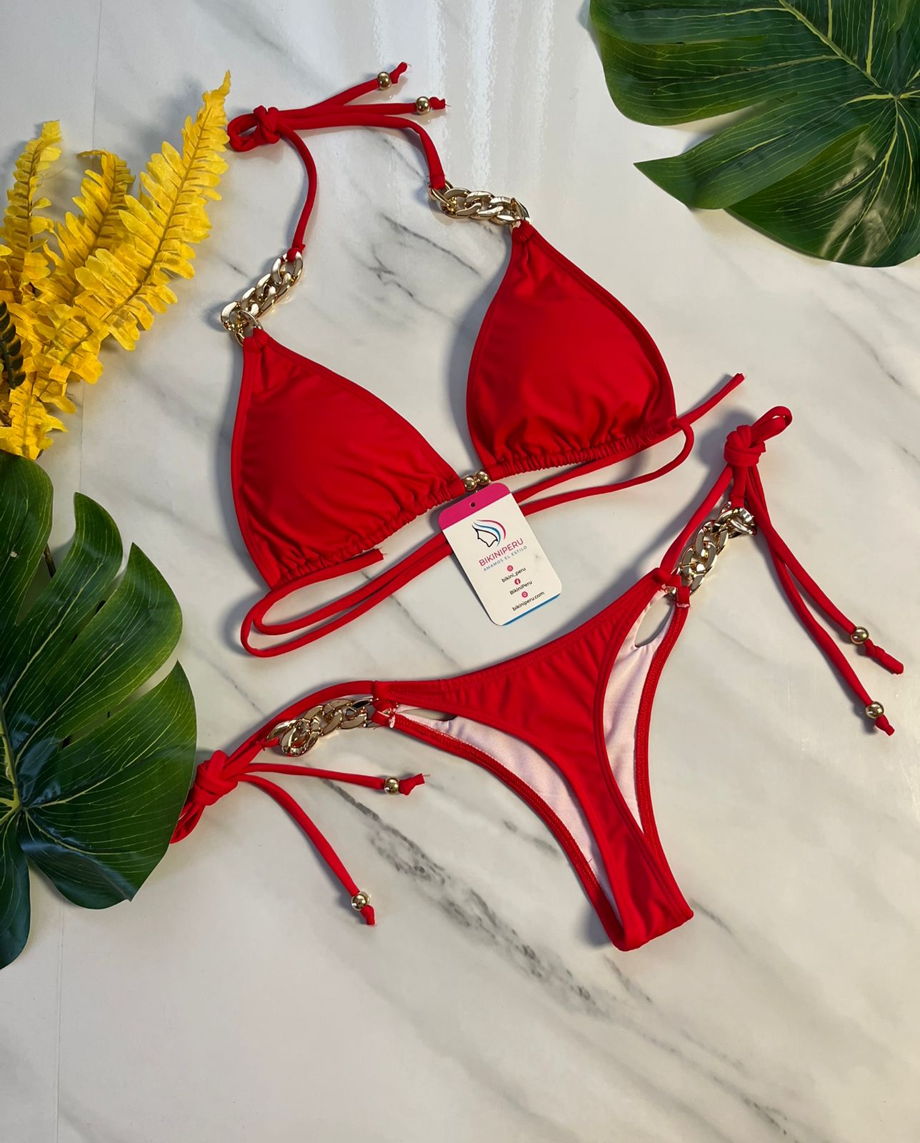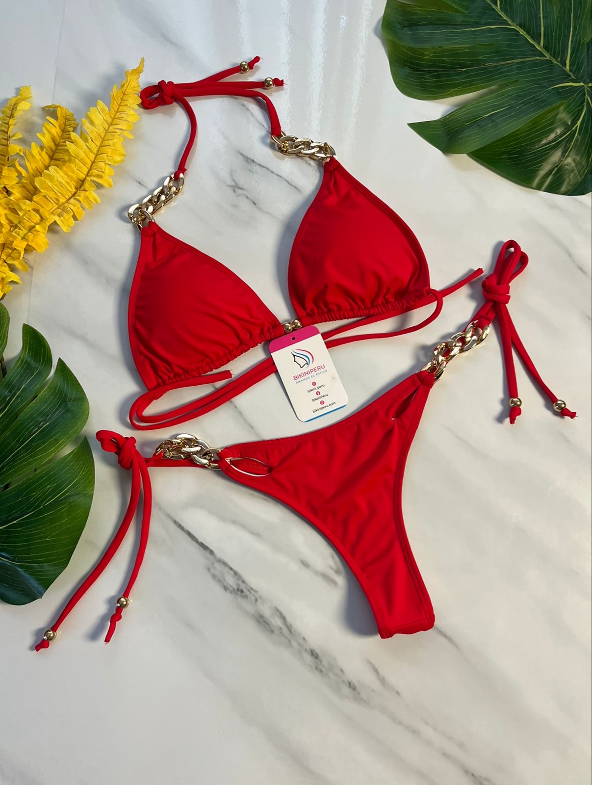 🔥 Top triángulo rojo intenso, con detalles de cadena dorada en los tirantes.