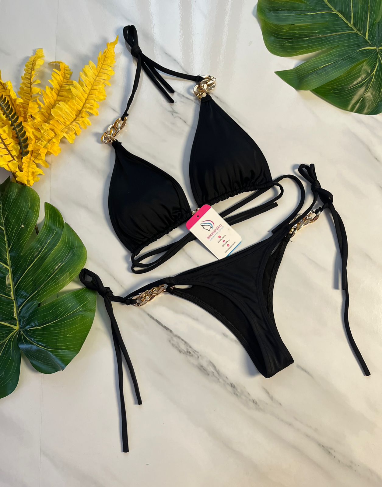 ✨ Top negro tipo triángulo, con cadenas doradas decorativas y copas removibles.