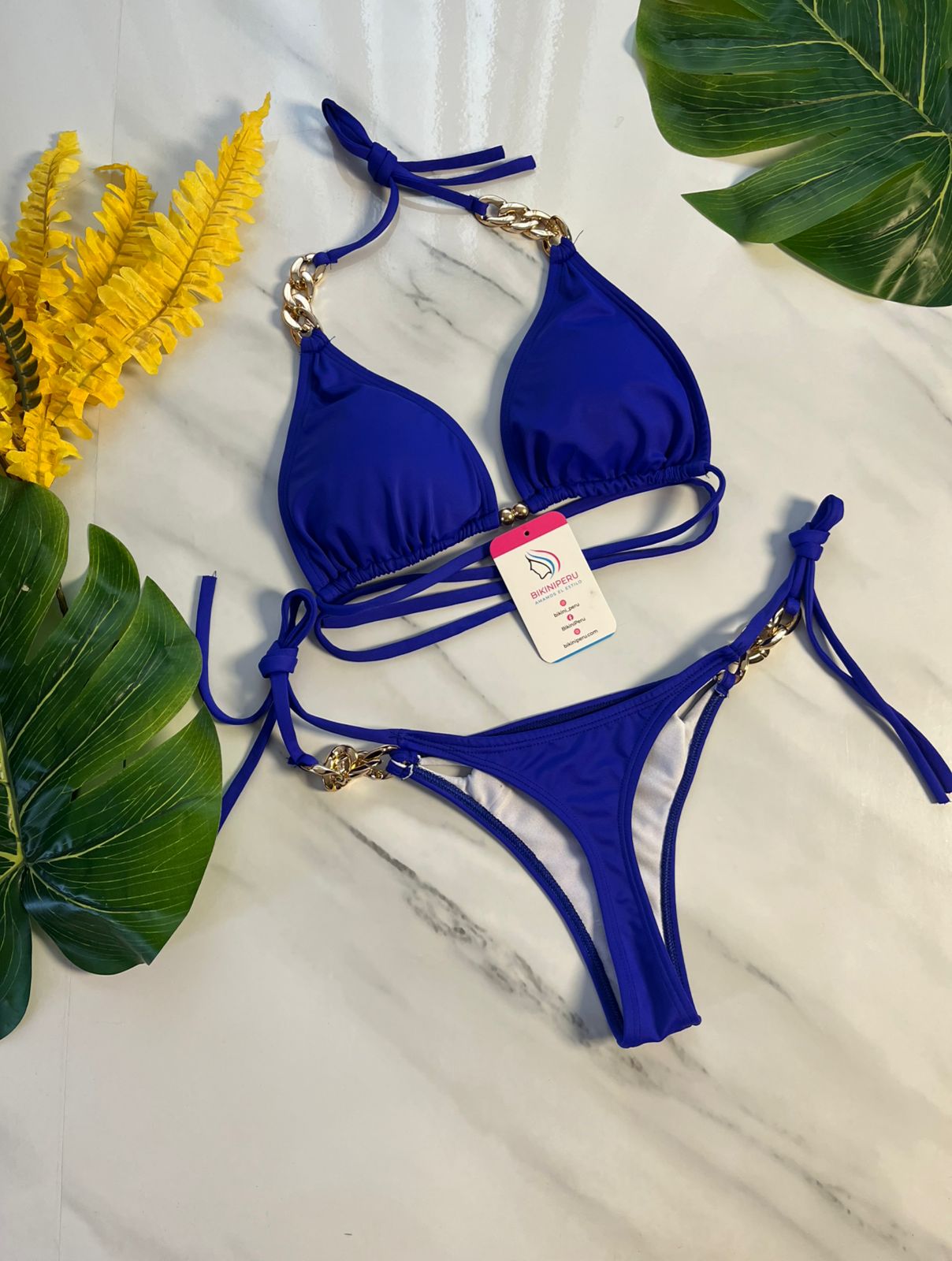 El bikini “Royal Gold” combina la fuerza del azul eléctrico con la elegancia de las cadenas doradas. Su corte semihilo estiliza la figura, y sus detalles metálicos hacen de esta pieza una joya de playa.