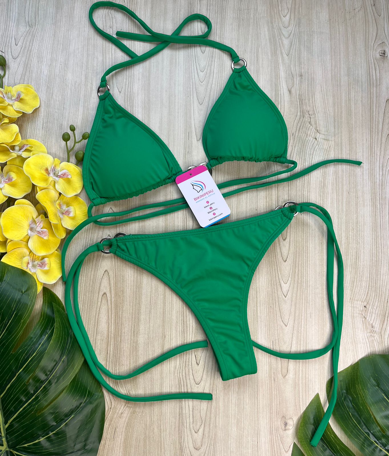 El bikini “Green Aura” es perfecto para quienes prefieren colores sólidos pero con personalidad. El verde esmeralda es un tono que resalta todos los tonos de piel, y sus argollas metálicas aportan un detalle moderno y chic.
