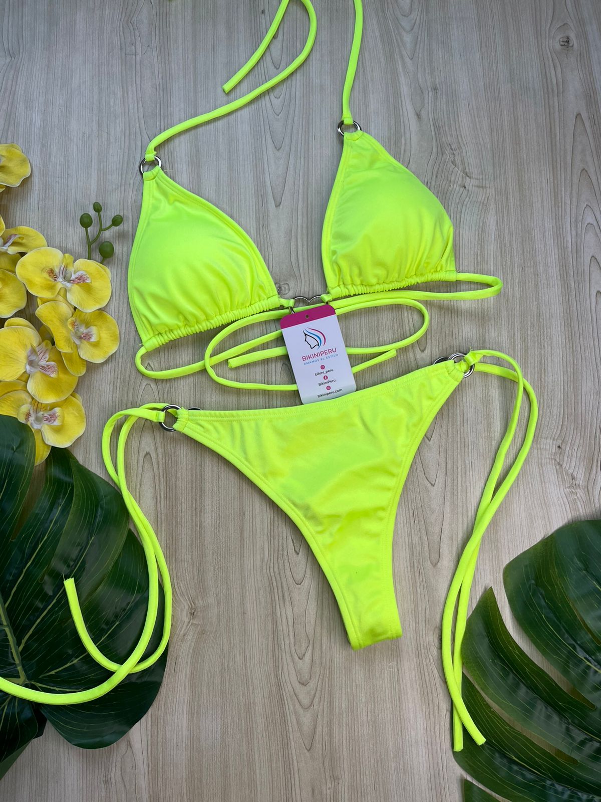 El bikini “Electric Lemon” es el equilibrio perfecto entre lo simple y lo atrevido. Su color amarillo neón es ultra vibrante, y las argollas metálicas en top y trusa aportan un detalle moderno que estiliza tu figura.