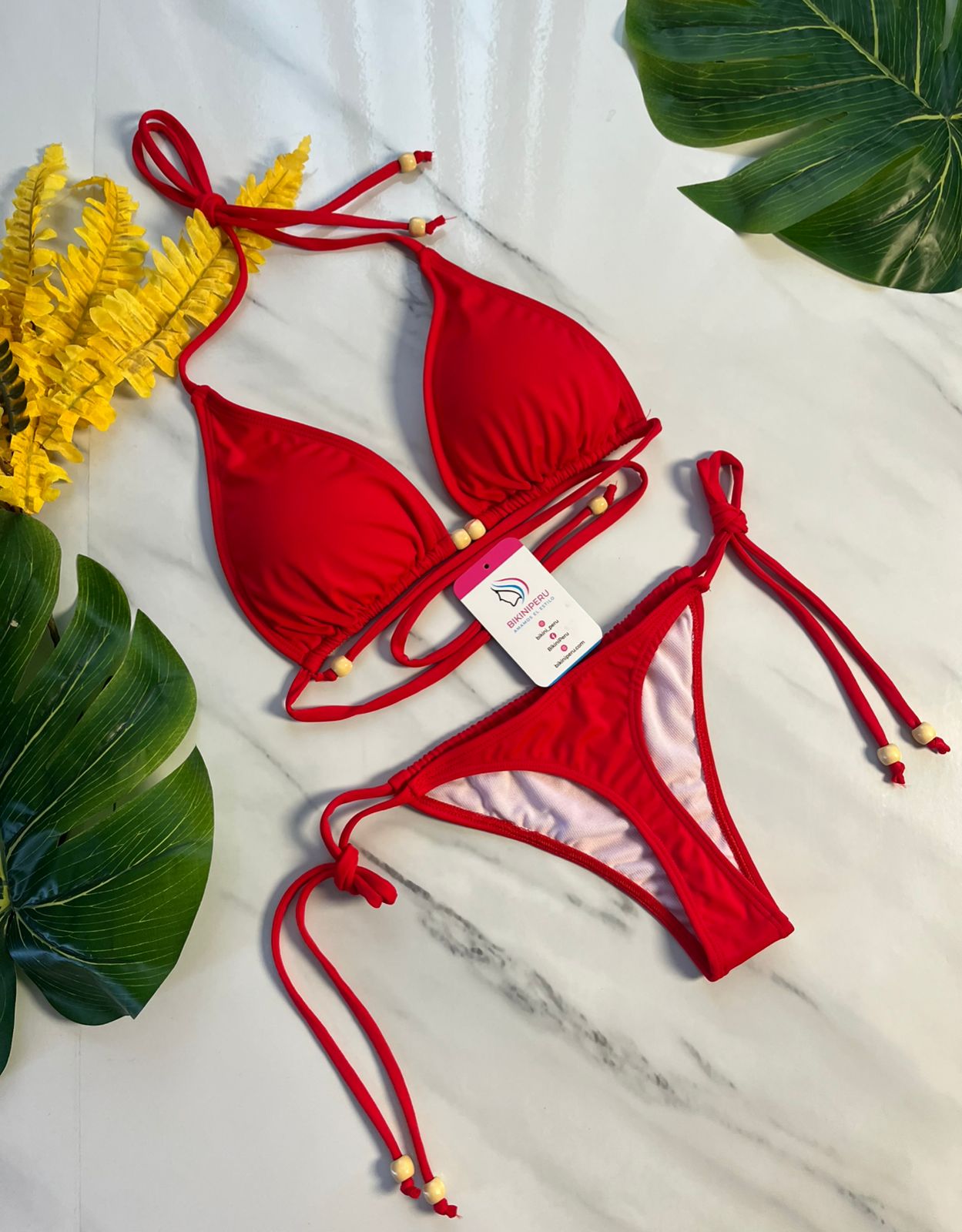 El bikini “Red Pearl” combina el poder del rojo con un diseño tradicional que nunca falla. Las mostacillas decorativas en los lazos le dan un toque original y coqueto, ideal para quienes cuidan cada detalle.