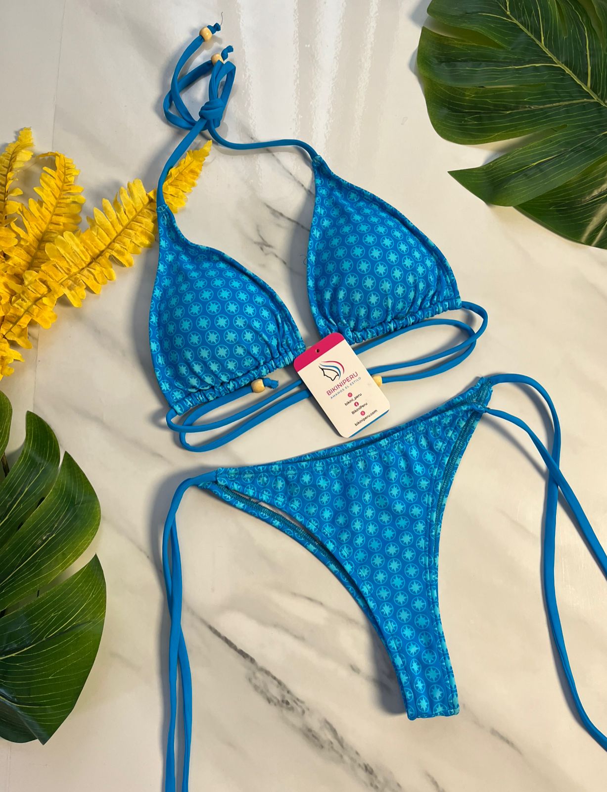 El bikini “Blue Star” es ideal para quienes buscan un look divertido, fresco y con personalidad. Su estampado de estrellitas blancas sobre fondo celeste vibrante transmite alegría, mientras que su corte semihilo lo convierte en una prenda sexy y cómoda.