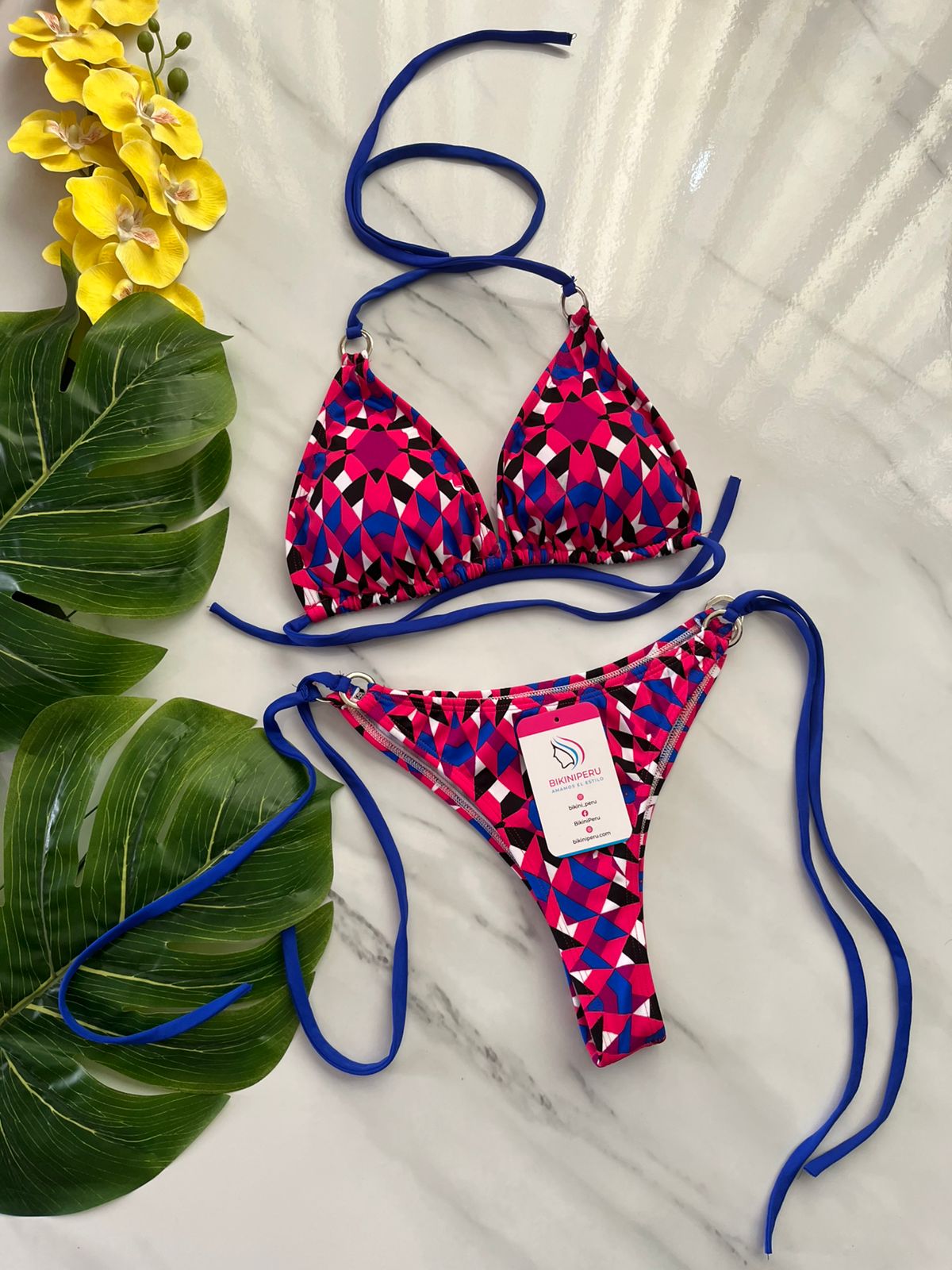 El bikini “GeoPop” destaca por su estampado geométrico en contraste, que lo hace visualmente impactante y único. Las tiras azul eléctrico y los detalles metálicos en top y trusa le suman modernidad y carácter.