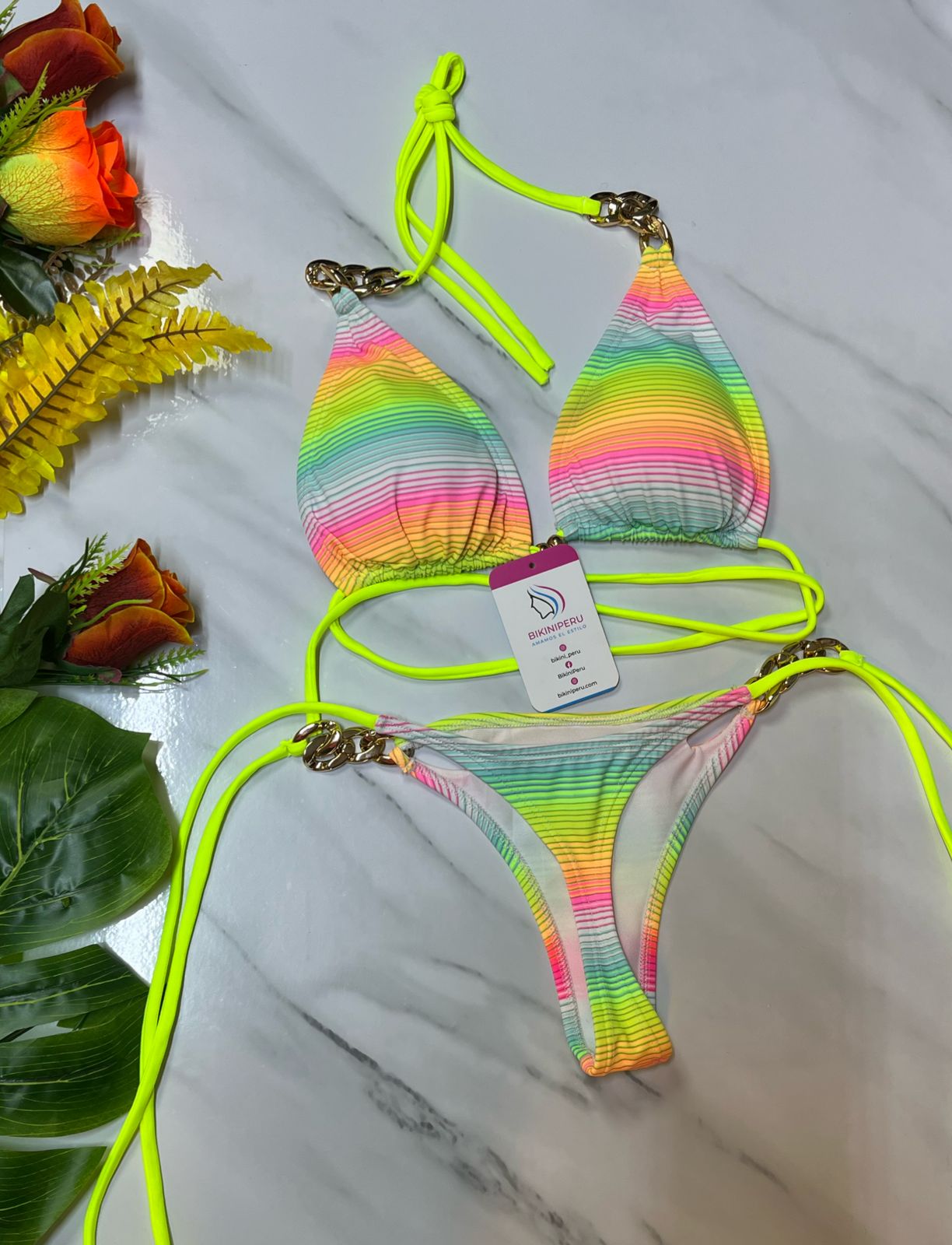 El bikini “Rainbow Luxe” es ideal para quienes aman los colores vibrantes, los detalles sofisticados y el estilo tropical. Sus tonos pastel en degradé arcoíris y las cadenas doradas decorativas lo convierten en una prenda súper llamativa y femenina.