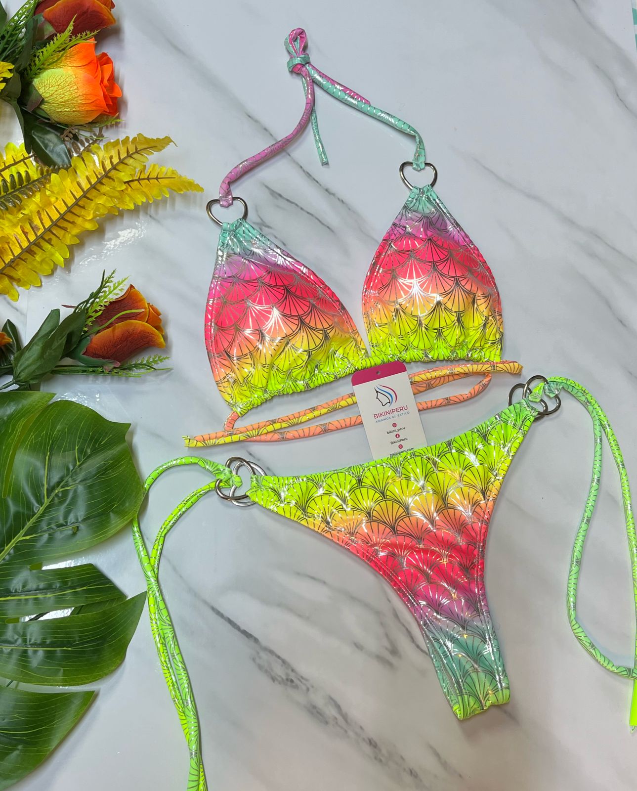 El bikini “Mermaid Glow” combina un diseño de escamas holográficas con tonos neón degradados que van del rosa al verde limón. Una pieza fantasía, sexy y divertida que realza tu figura y tu personalidad.