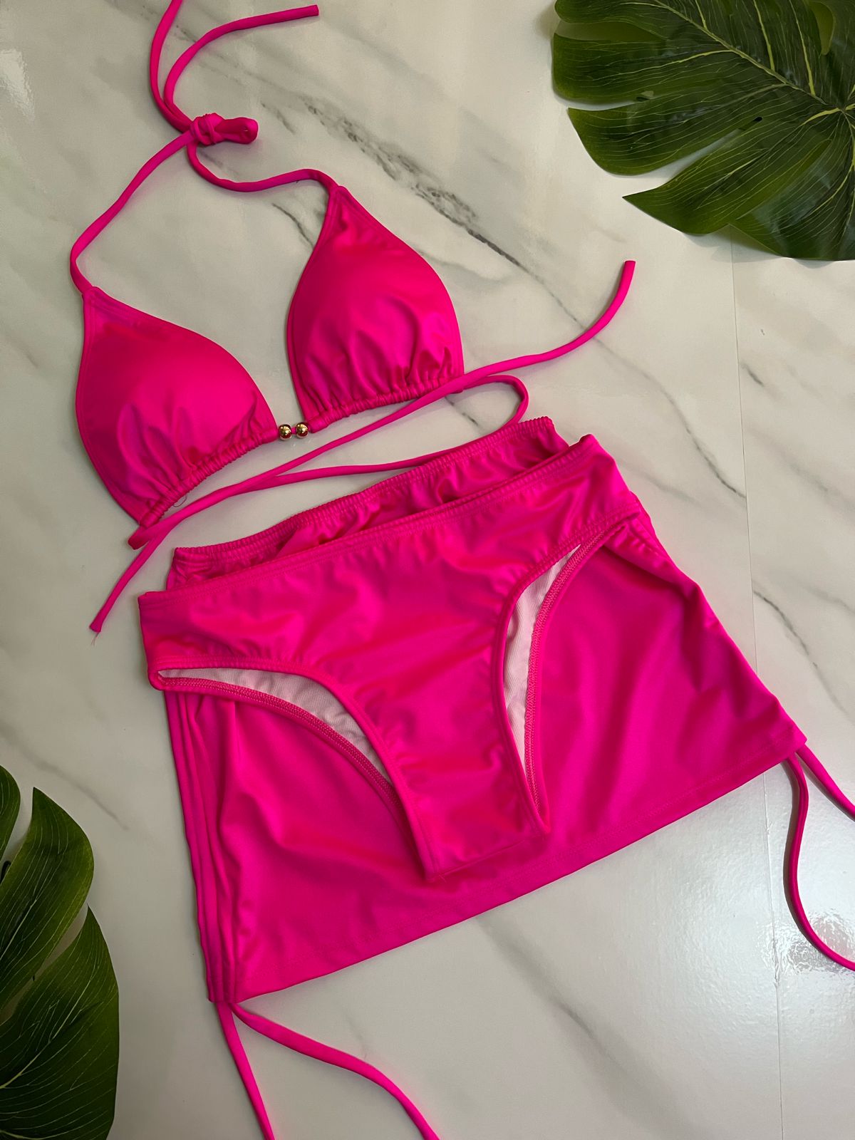 Dale un upgrade a tu verano con este set de baño de 3 piezas en color fucsia intenso, diseñado para destacar tu figura con estilo y confianza.